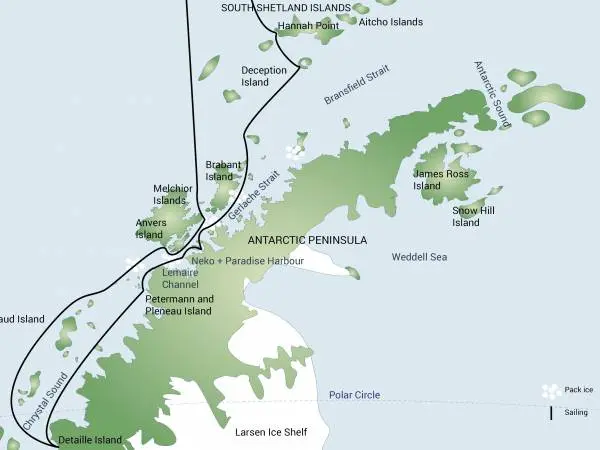 Los deslumbrantes casquetes polares, los colosales glaciares y las imponentes montañas de la Antártida solo rivalizan con las playas de arena blanca y la exuberante flora de las islas subantárticas. Ambas áreas albergan una gran variedad de pingüinos, ballenas, focas y aves marinas. Esta expedición al Círculo Polar y la Península Antártica pasa por aguas transitadas por ballenas jorobadas, minke y de aleta. Anclando en varios lugares de la región, la expedición ofrece la oportunidad de caminar, navegar en kayak y bucear en las aguas llenas de icebergs.