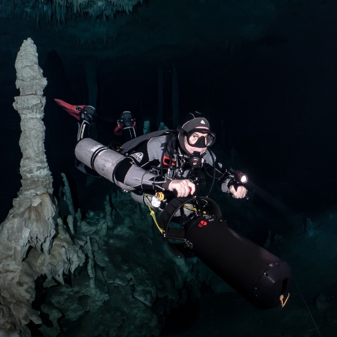 • Vehículo de propulsión para buceadores debidamente equipado. El tipo de DPV debe ser compatible con los sistemas de cuevas elegidos para las inmersiones.